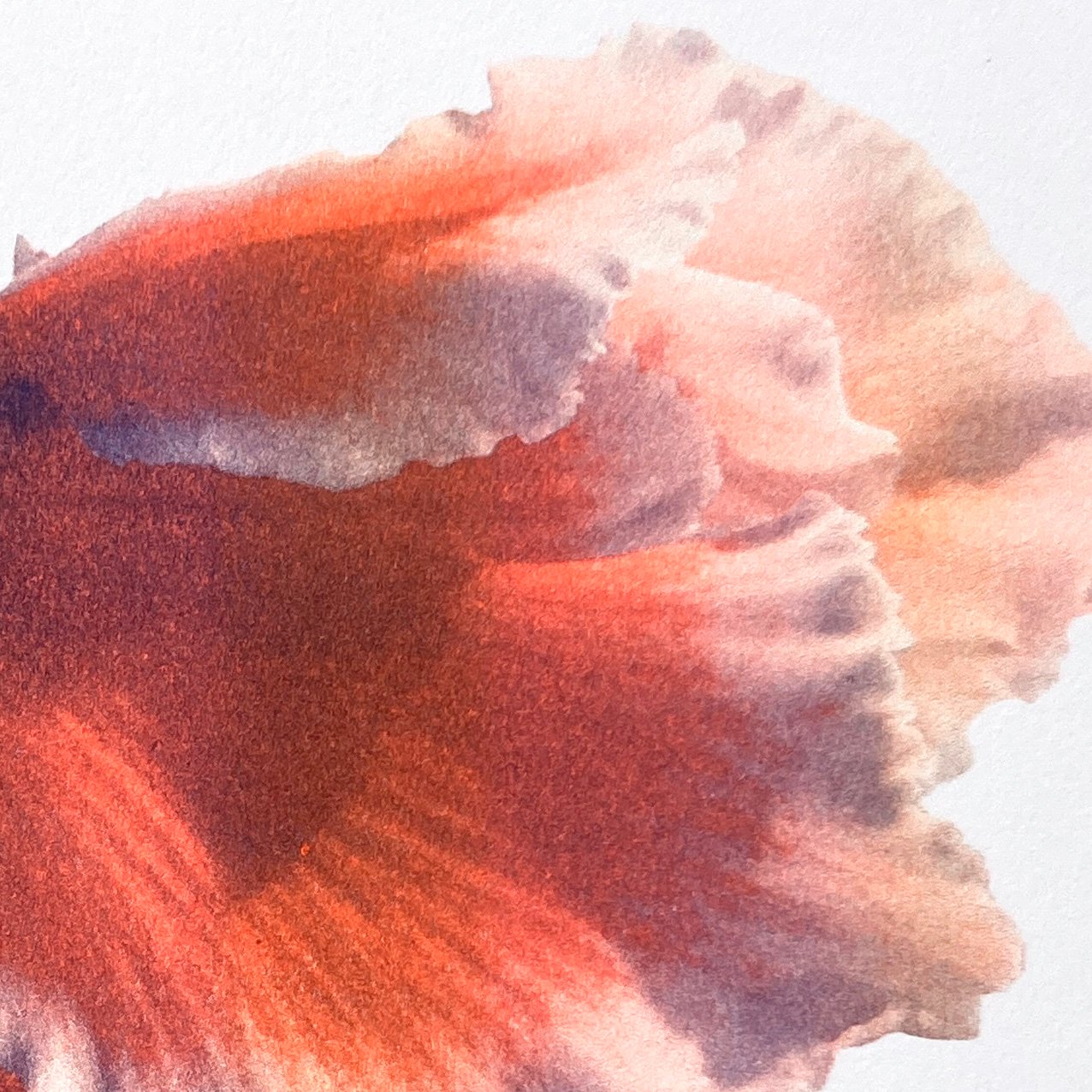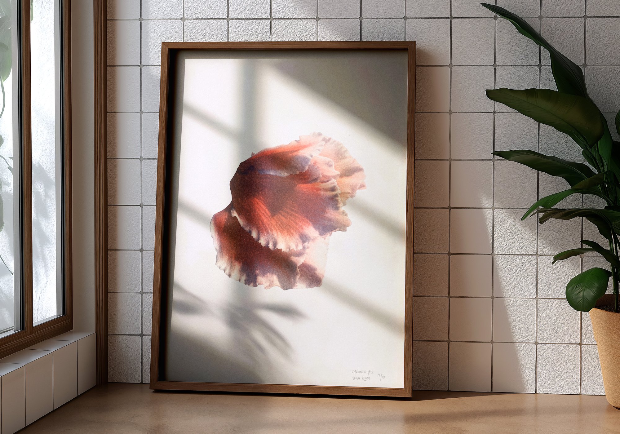 Découvrez Cyclamen #2, une impression en risographie originale aux couleurs vibrantes. Cette illustration joue sur la superposition de deux encres : un bleu profond et un orange fluo, offrant un grain et une texture uniques propres à la technique riso.