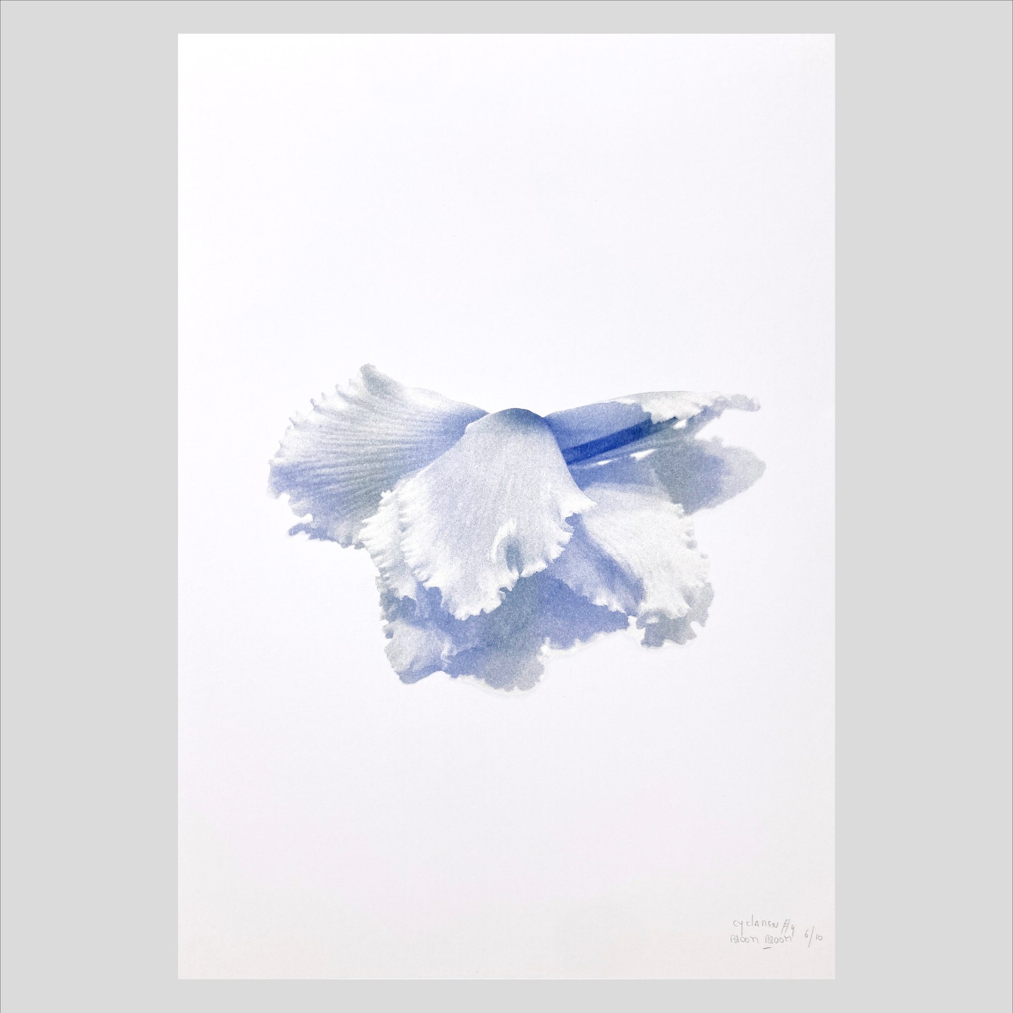 Découvrez Cyclamen #4, une impression en risographie originale aux couleurs vibrantes. Cette illustration joue sur les nuances d'une encre bleu offrant un grain et une texture uniques propres à la technique riso.