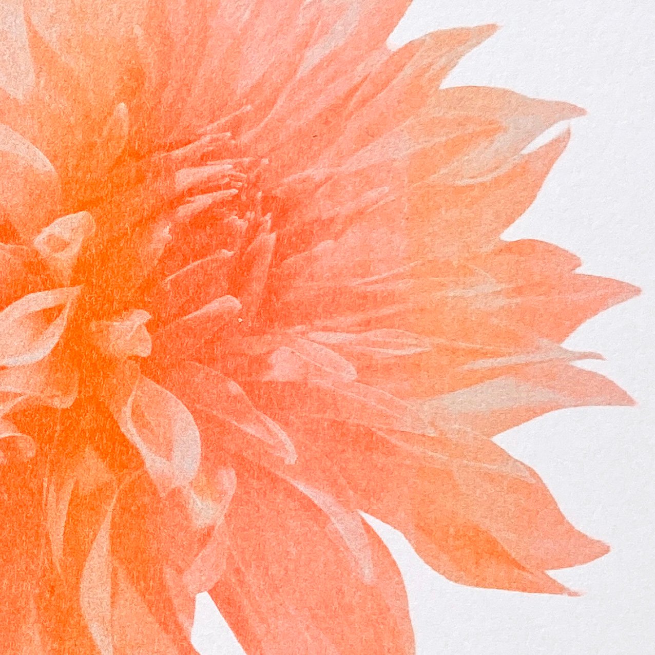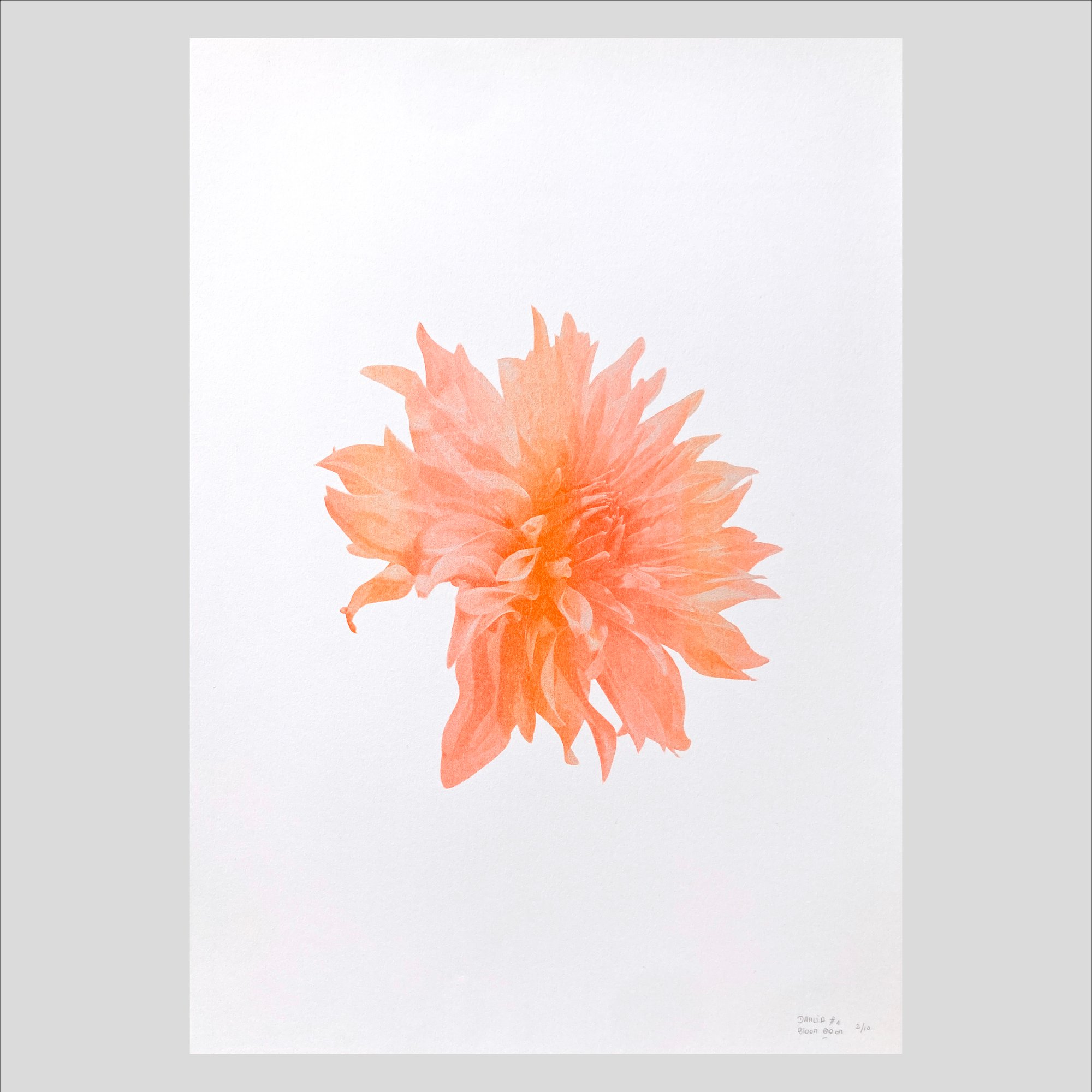 Découvrez Dahlia #1, une impression en risographie originale aux couleurs vibrantes. Cette illustration joue sur les nuances d'une encre orange fluo offrant un grain et une texture uniques propres à la technique riso.